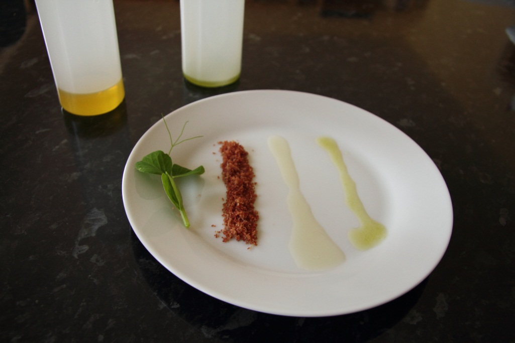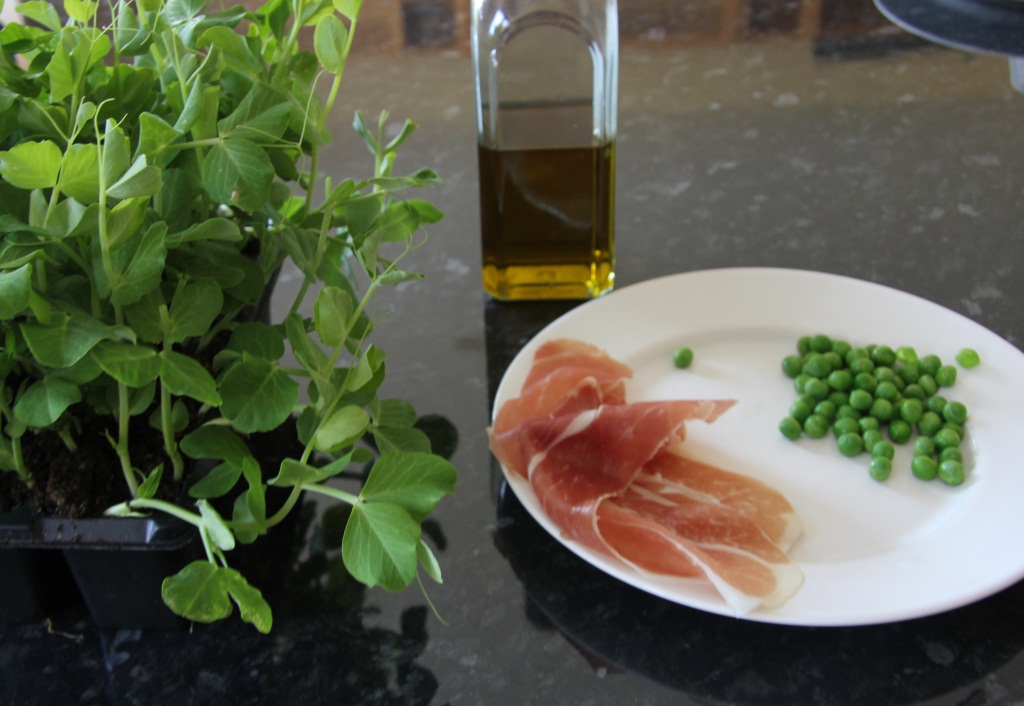 I though I’d take the opportunity experiment with garnishes. I noticed that young pea plants were being sold in our local garden shop, so thought I’d get a tray. To add to the pea theme, I thought I’d do a pea oil to drizzle on the plate – I briefly blanched some frozen peas (it is a bit early for fresh), put them in a pan with some olive oil (not virgin as I didn’t want the strong taste) as well as a couple of the pea shoots as I had them to hand, the then heated it all for about half an hour, crushing with a masher a few times whilst heating. In hindsight I think I would have been better off blending and straining, but the green colour came out and it had a lovely sweet pea taste. Finally, I made a Parma ham dust to sprinkle on the top – as a garnish and seasoning which I hoped would work well with the black pudding, and to be a little more subtle than the old technique of wrapping scallops in Parma. To do this, I put a few pieces of Parma ham on a baking sheet and put in the oven for an hour on about 90 degrees C – once it had cooled I put it through grinder. The great thing was that I could make all of this well in advance.